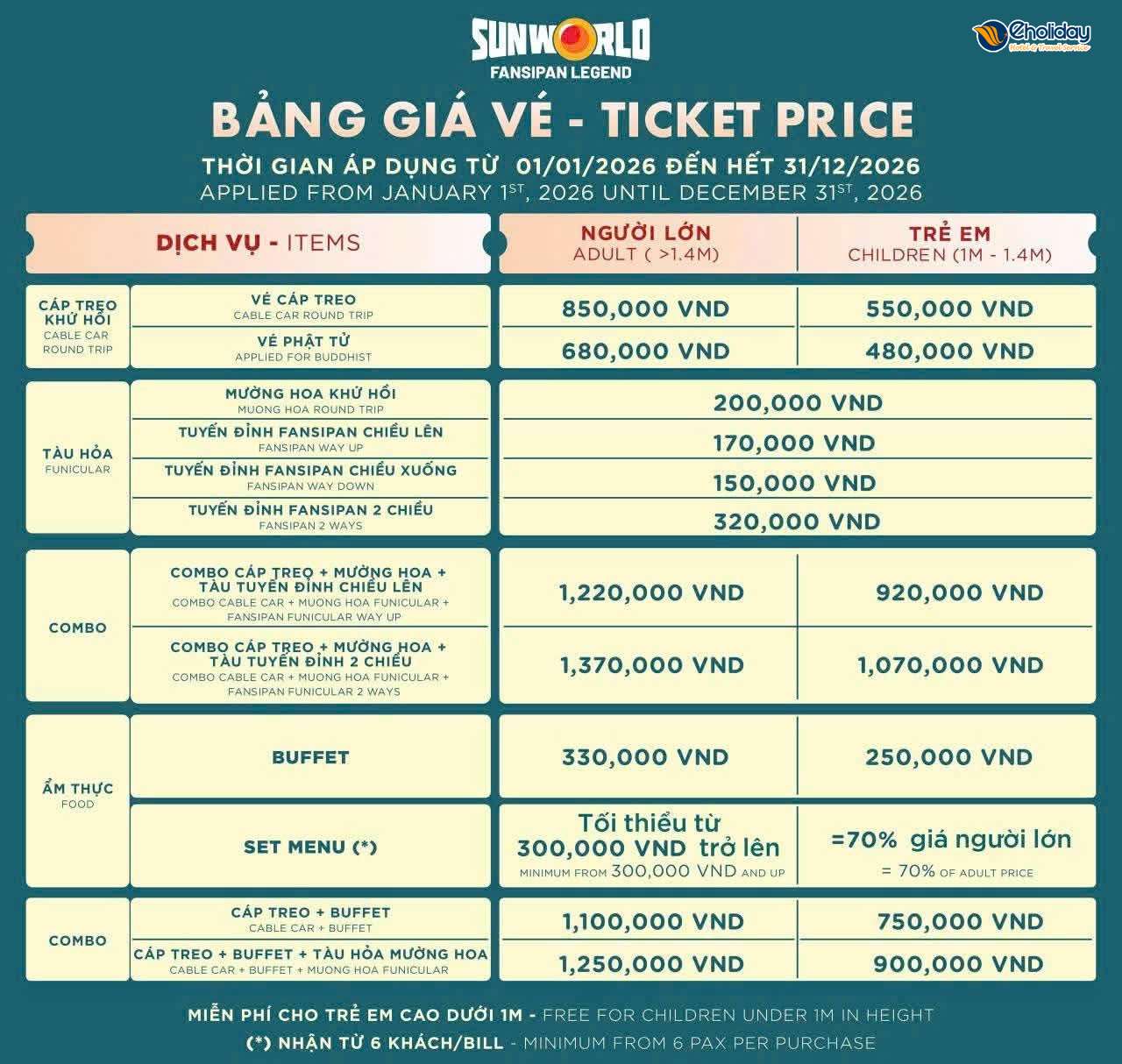 - Trẻ em (1m-1m4): 750.000